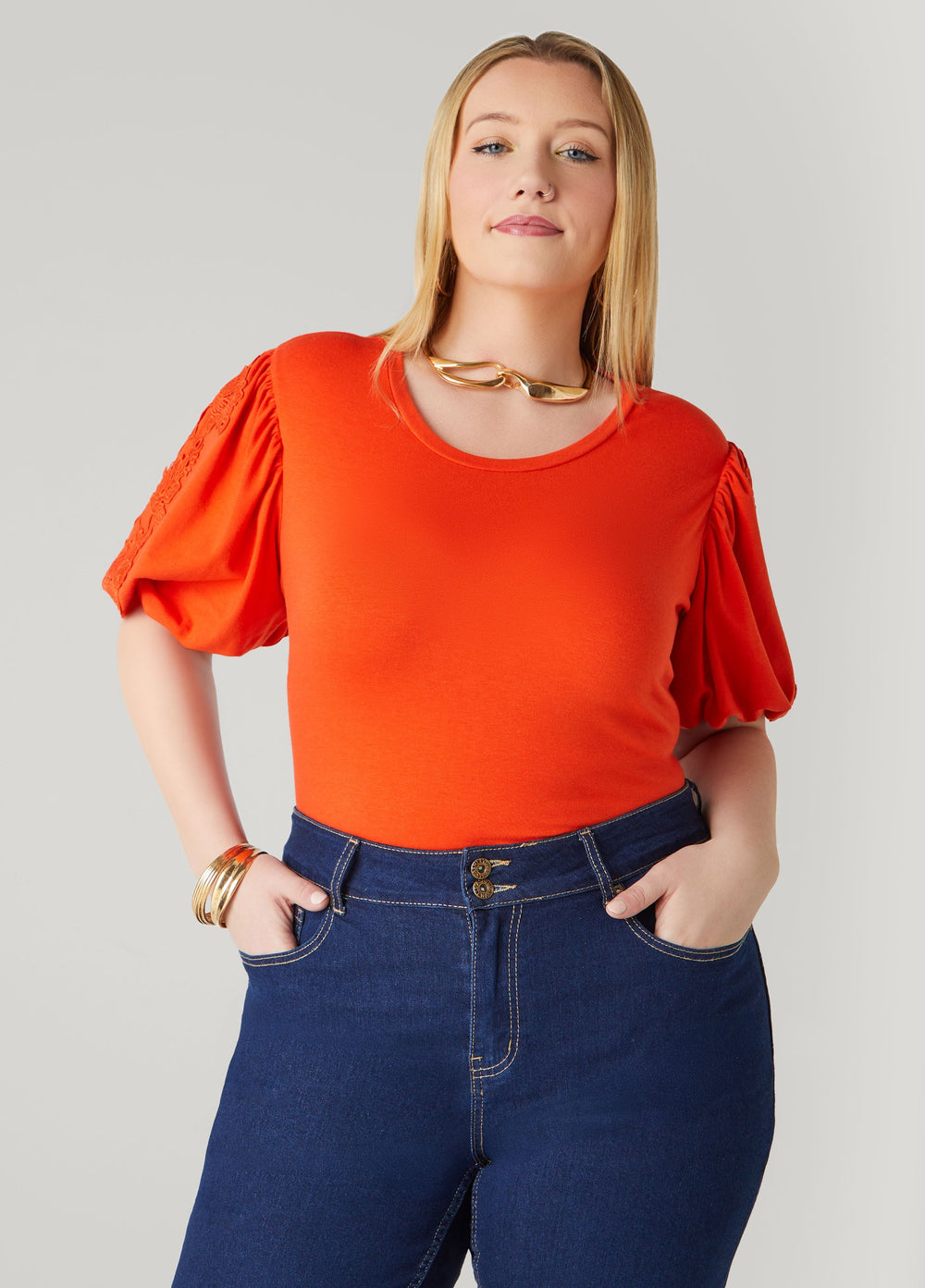 Soft with a dose of drama. this jersey tee brings everyday comfort to life with floral-appliquéd puff...