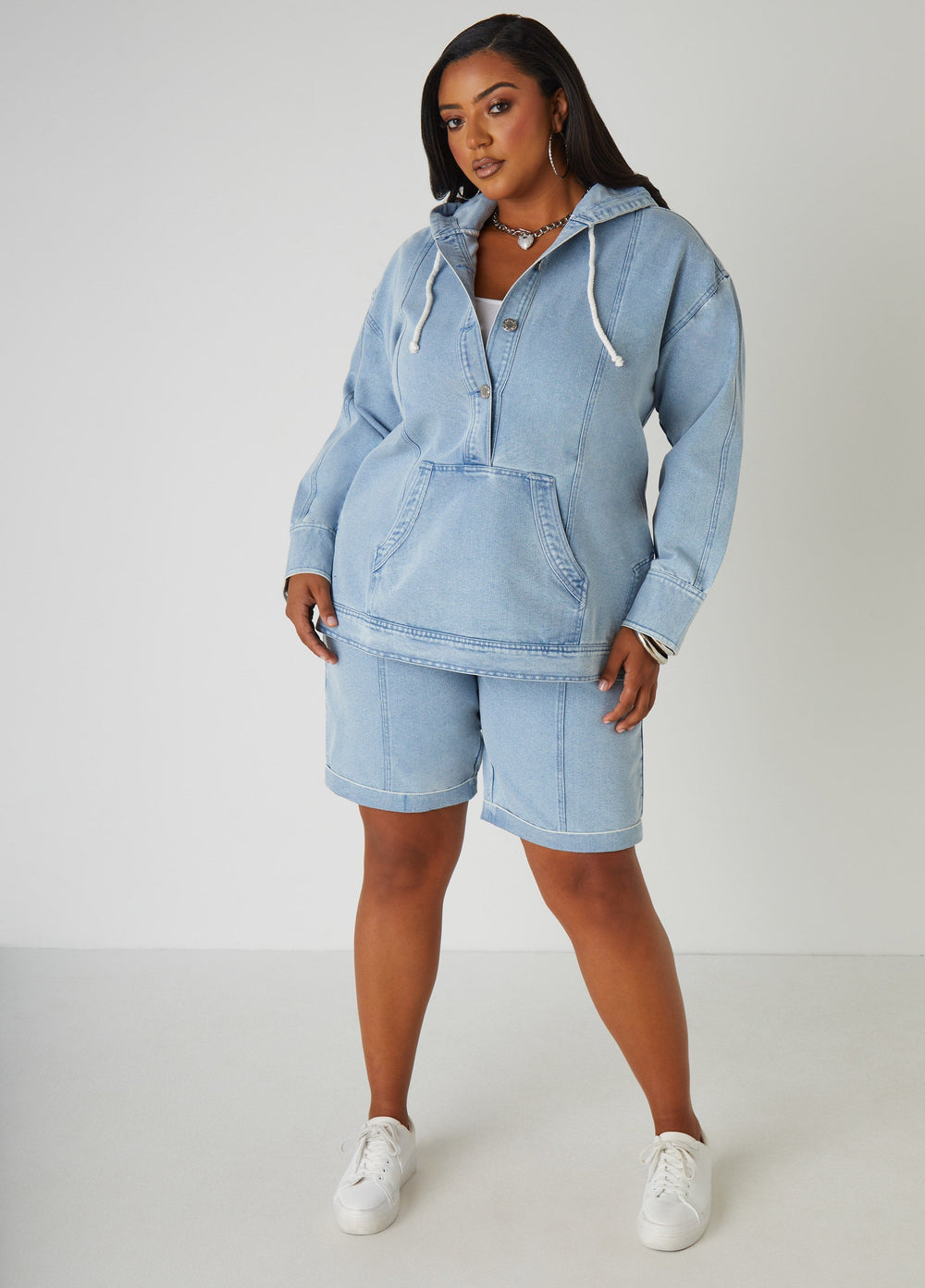 These high-rise denim Bermuda shorts keep it classic with a cuffed hemline and back patch pockets. Pair them with the matching denim pullover for an effortlessly put-together set.