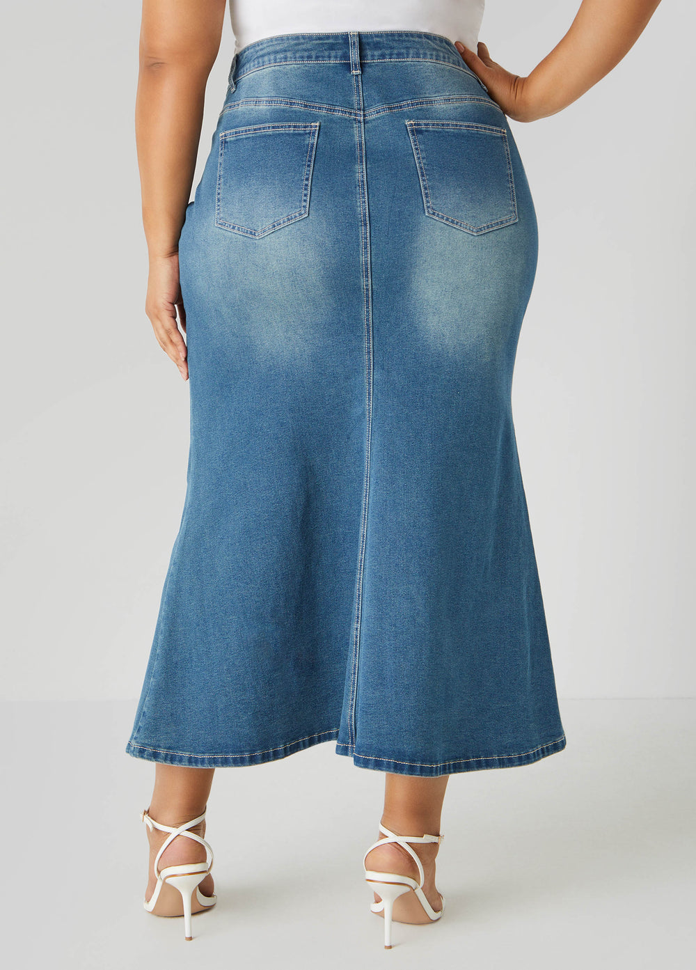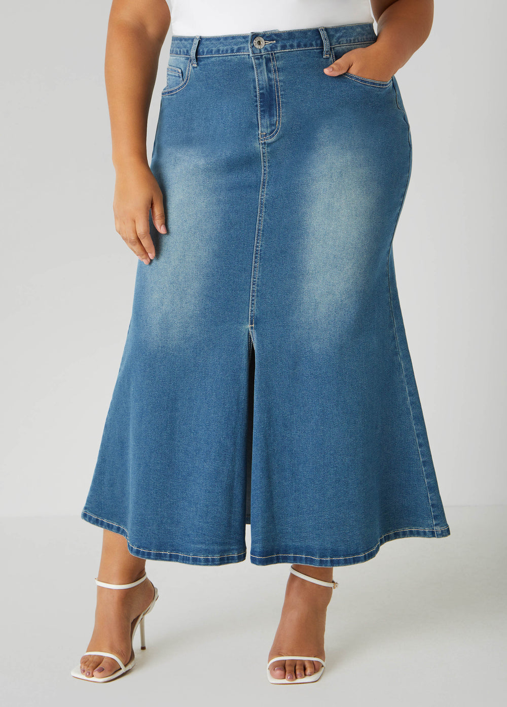 Long. lean. and made to serve. This stretch-denim maxi hugs in all the right places. then hits...