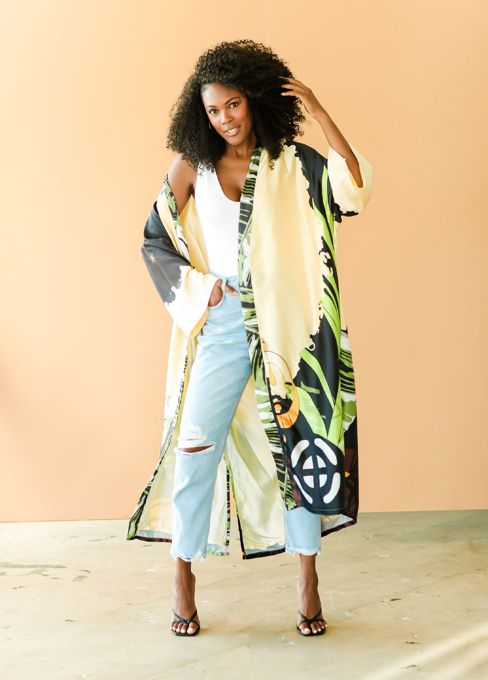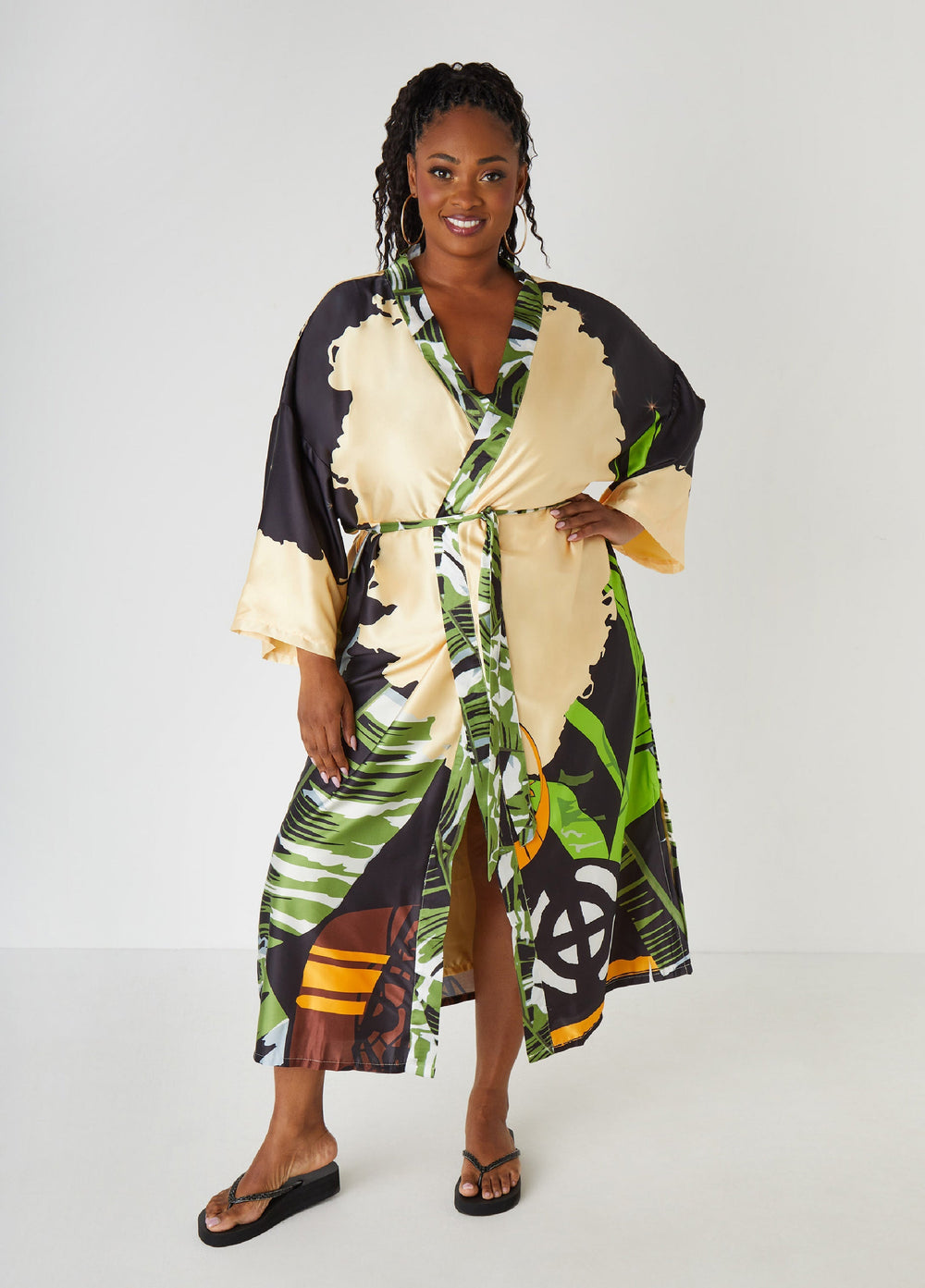 xBig hair. calming energy—Ziggy is here to bring your zen dreams to life. This Pardon My Fro™ satin kimono brings all the vibes with a stunning graphic of a blonde afro queen. draped in bold accessories and set against a lush greenery backdrop. The sash-tie waist lets you cinch it up or let it flow. depending on the mood. Luxe. vibrant. and unapologetically fly—just like you.