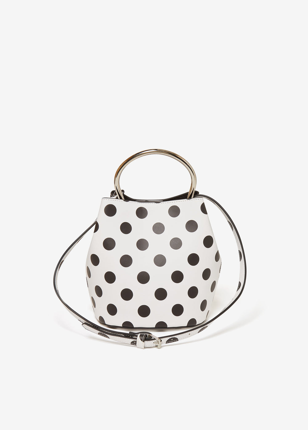 xPlayful style is the name of the game with this polka dot faux leather bucket bag! Featuring silver-tone hardware and a sleek top handle. this bag combines bold style with effortless charm. The detachable adjustable shoulder strap gives you versatility. making it perfect for any occasion.