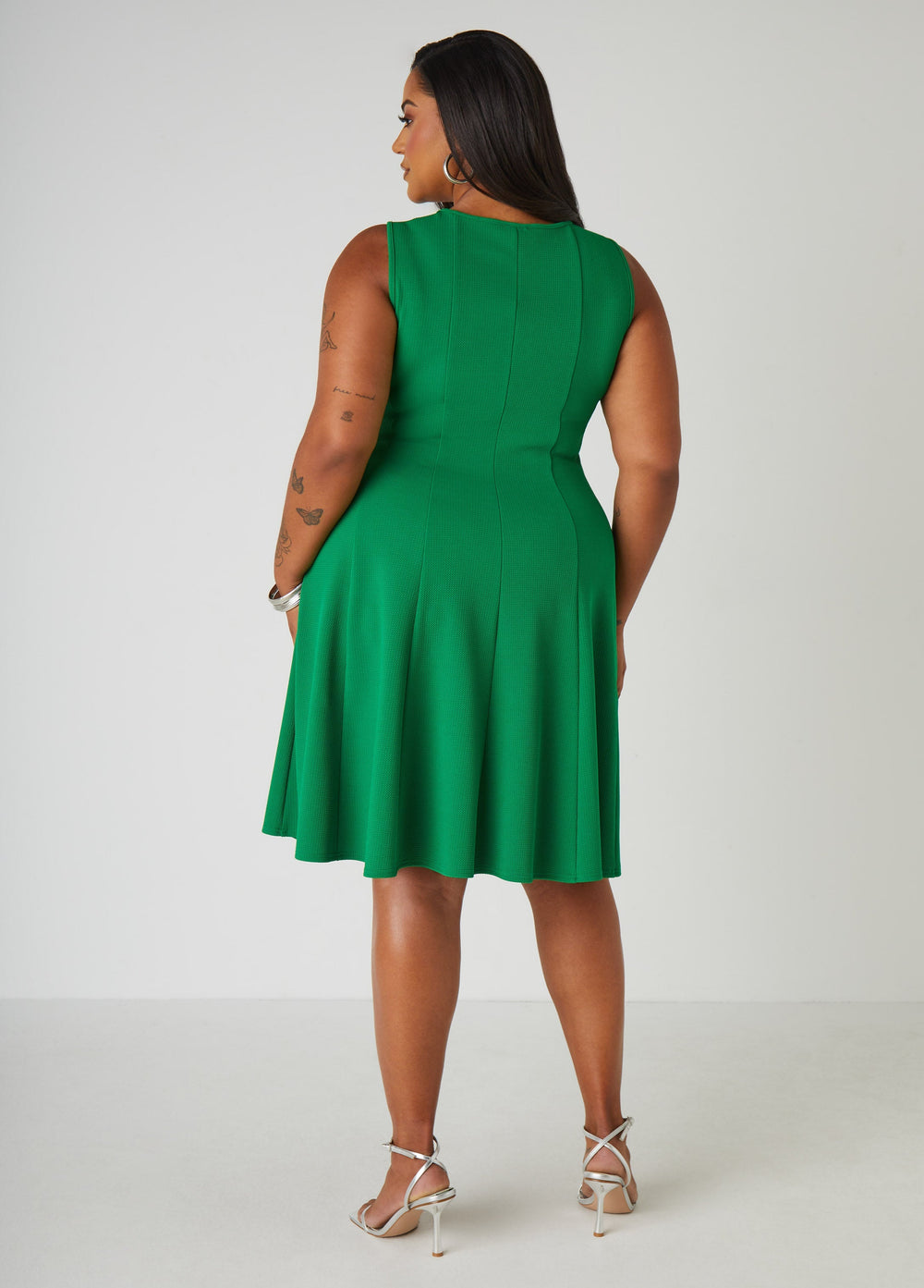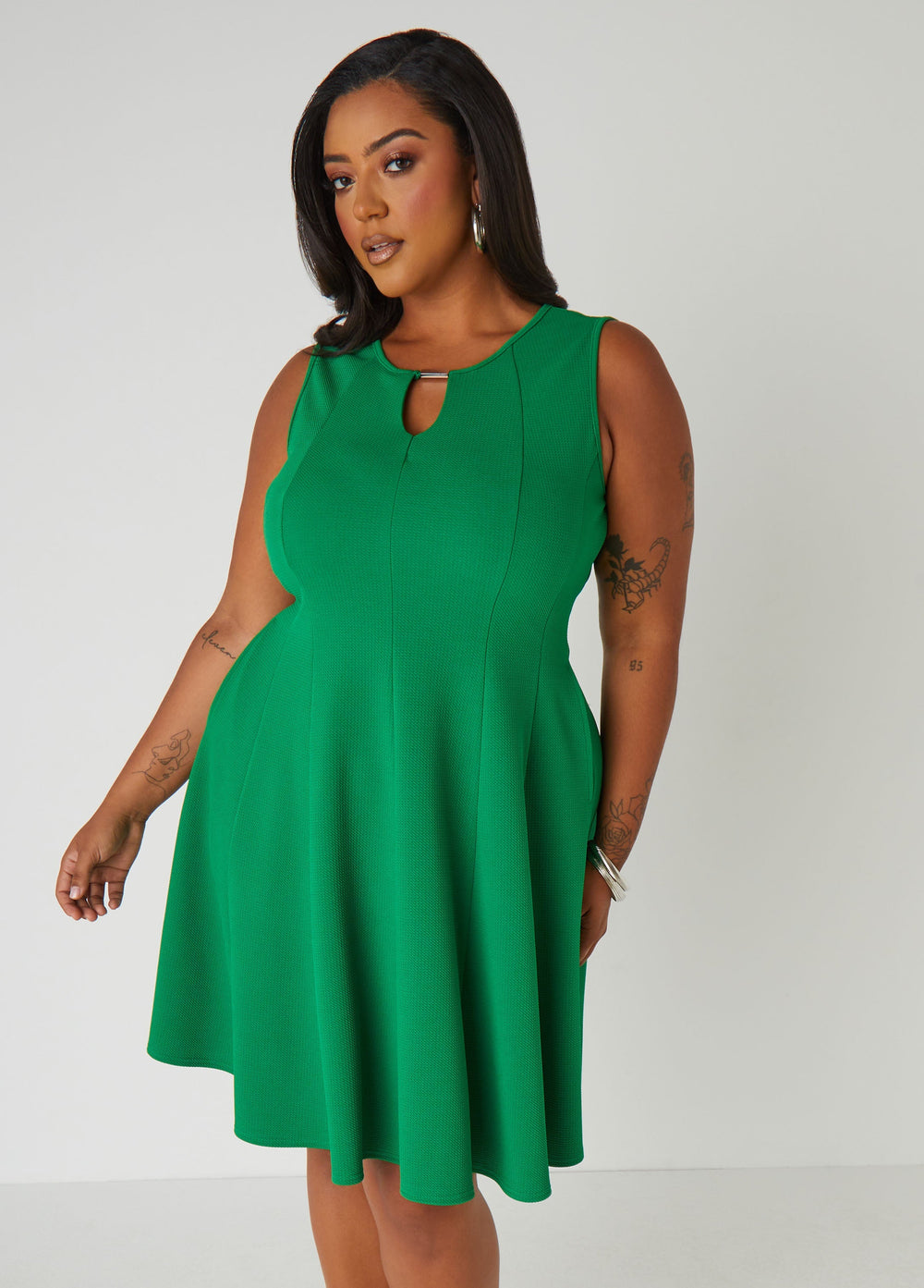 This textured-knit dress features a sexy cutout with a sleek bar embellishment. plus side slit pockets for that effortless cool factor. Finished with an A-line skirt that moves with you. it's the perfect mix of structure and style.