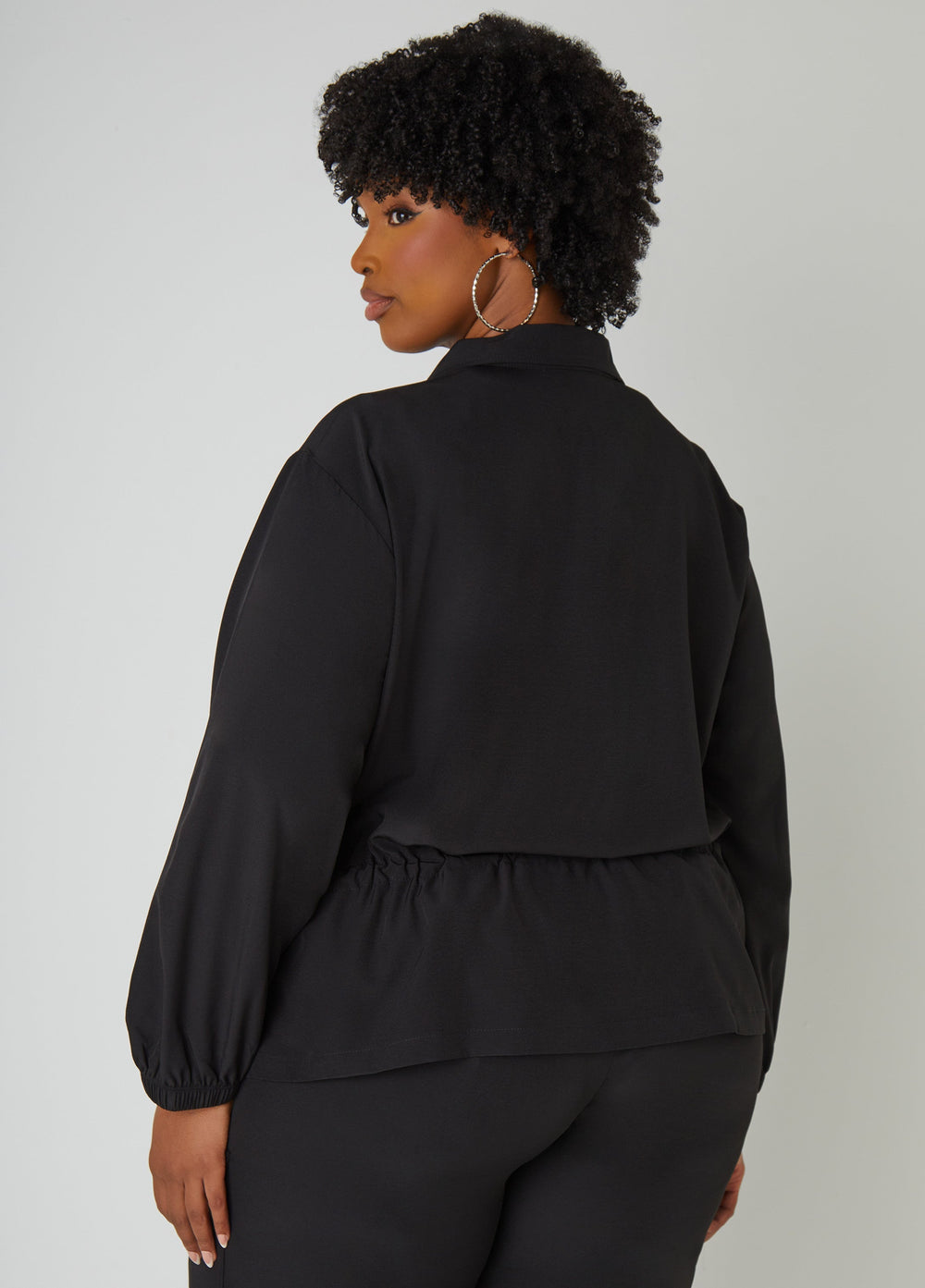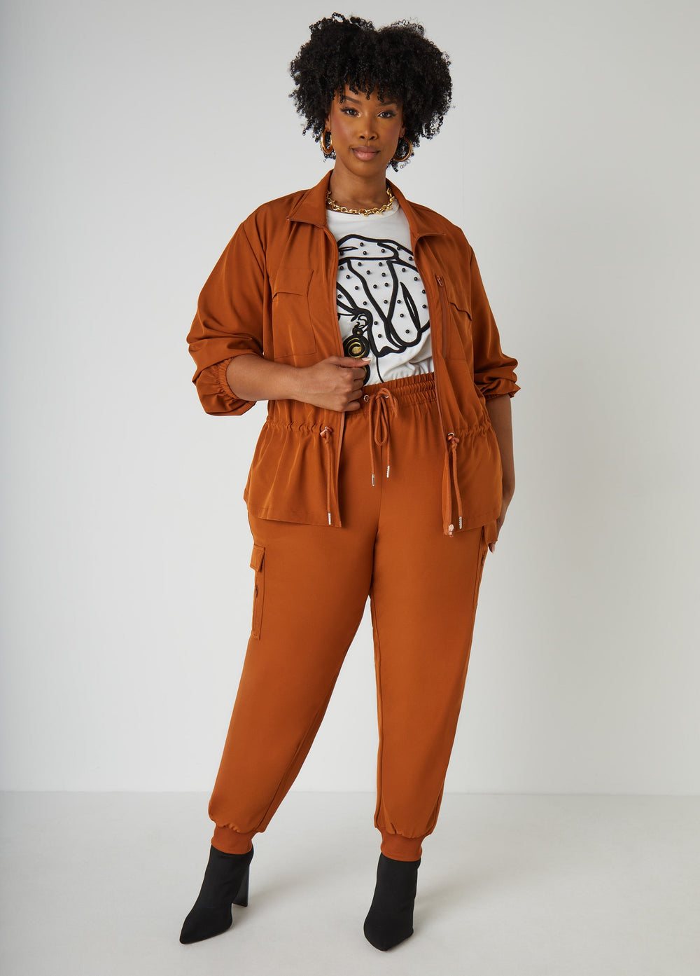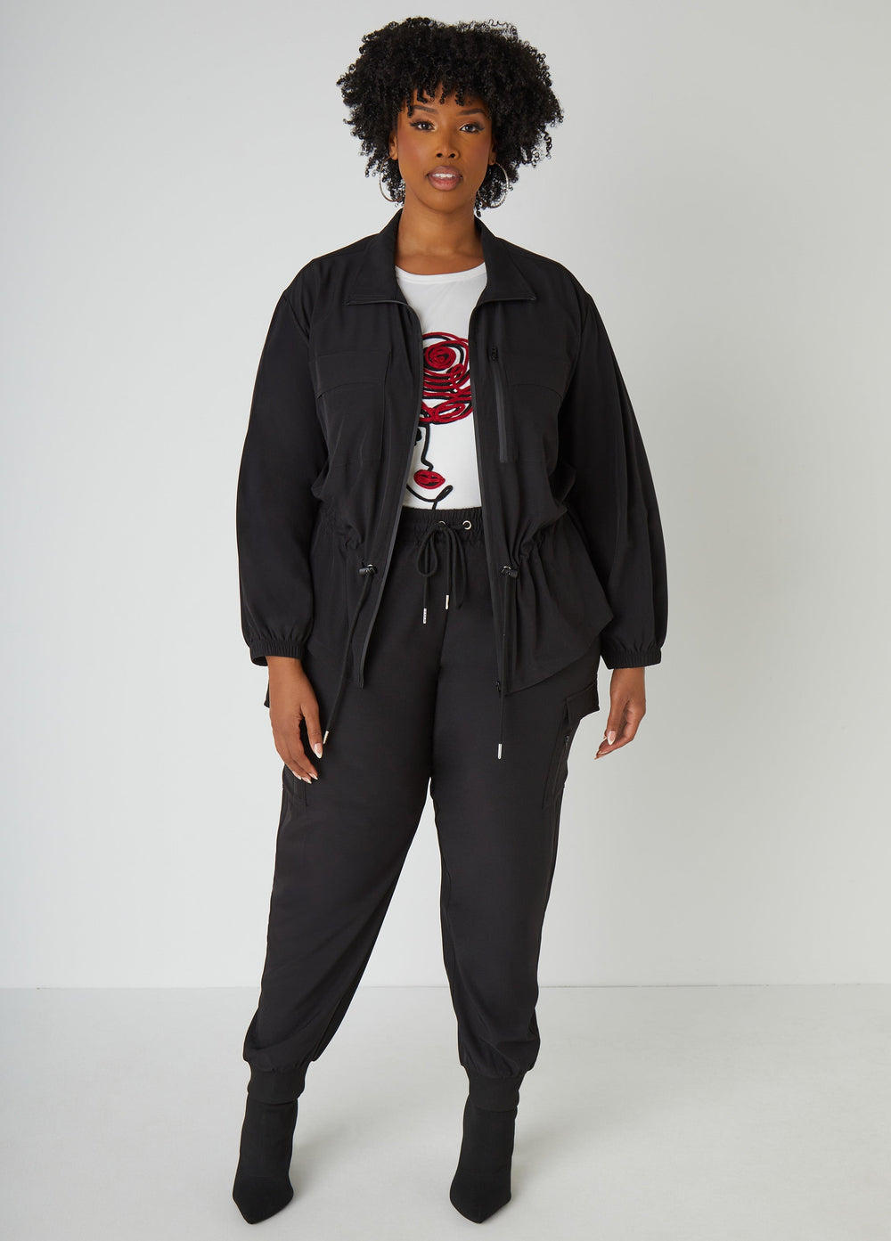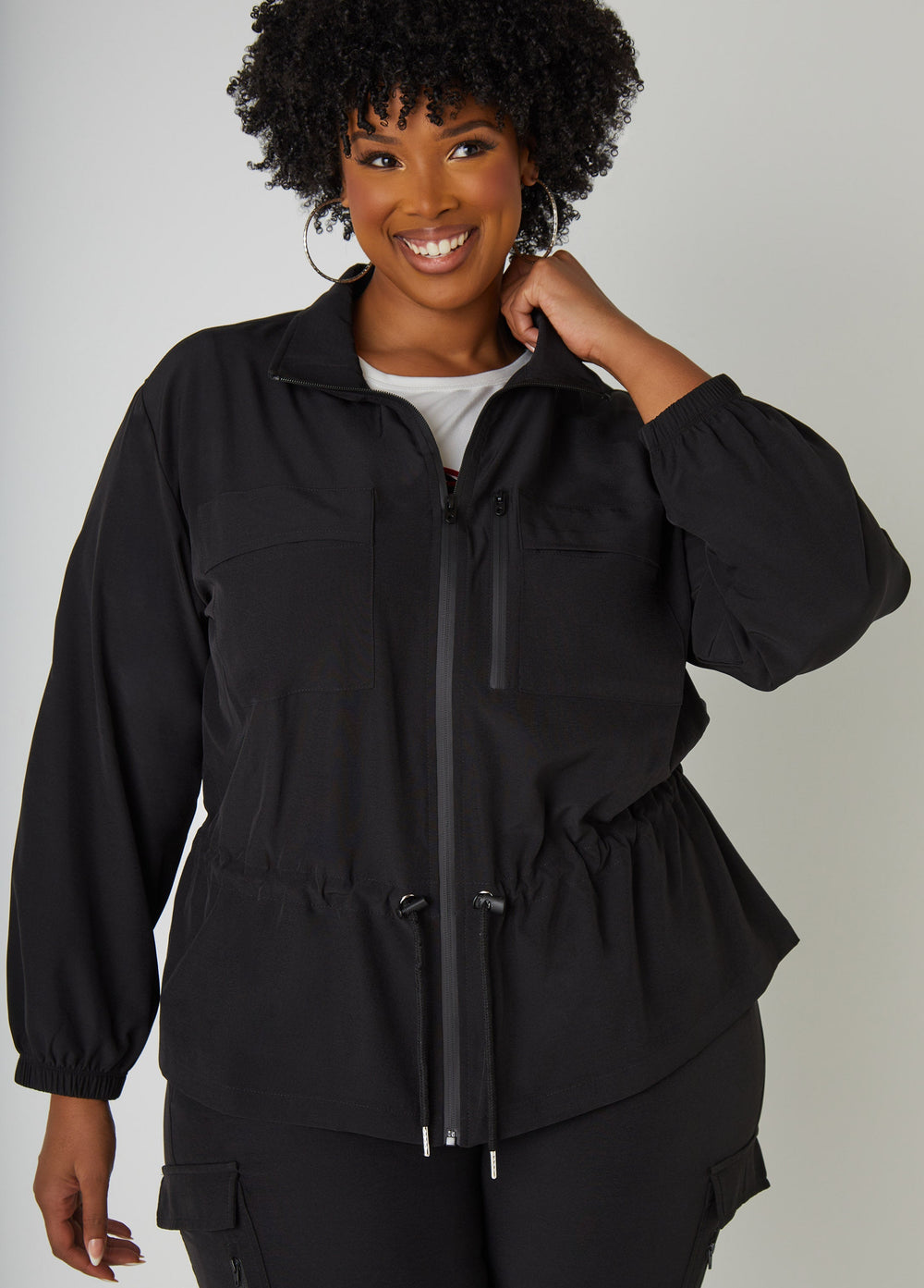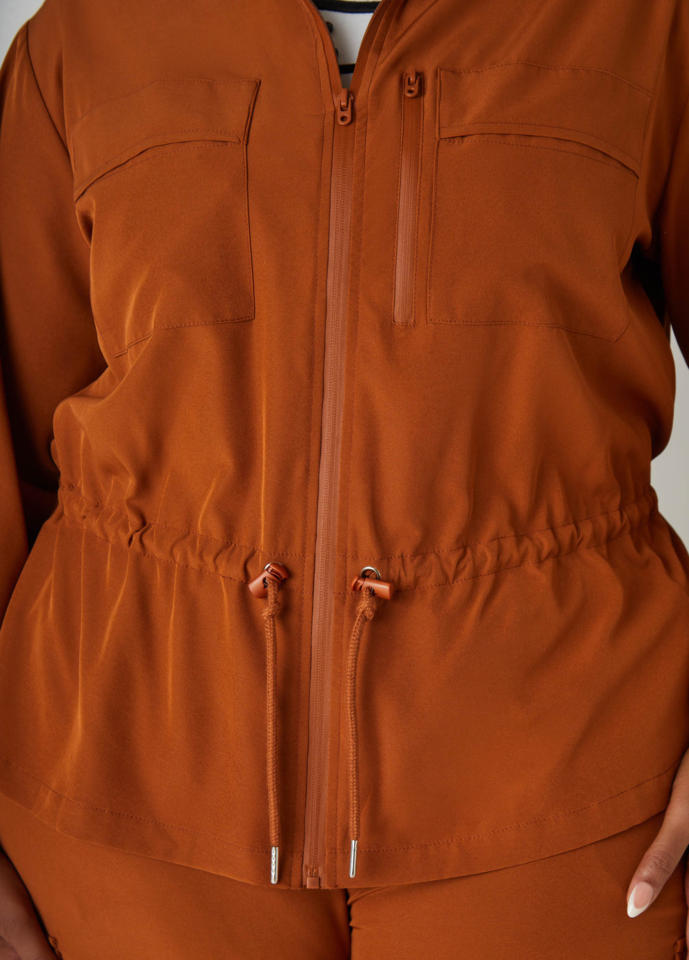 Utility. but make it fashion. This woven jacket comes through with flap pockets at the bust. a zip detail. elasticized sleeve cuffs. and a drawstring waistband for that cinched-up perfection. Rock it solo or level up with the matching joggers for a full set that's serving easy. breezy cool.